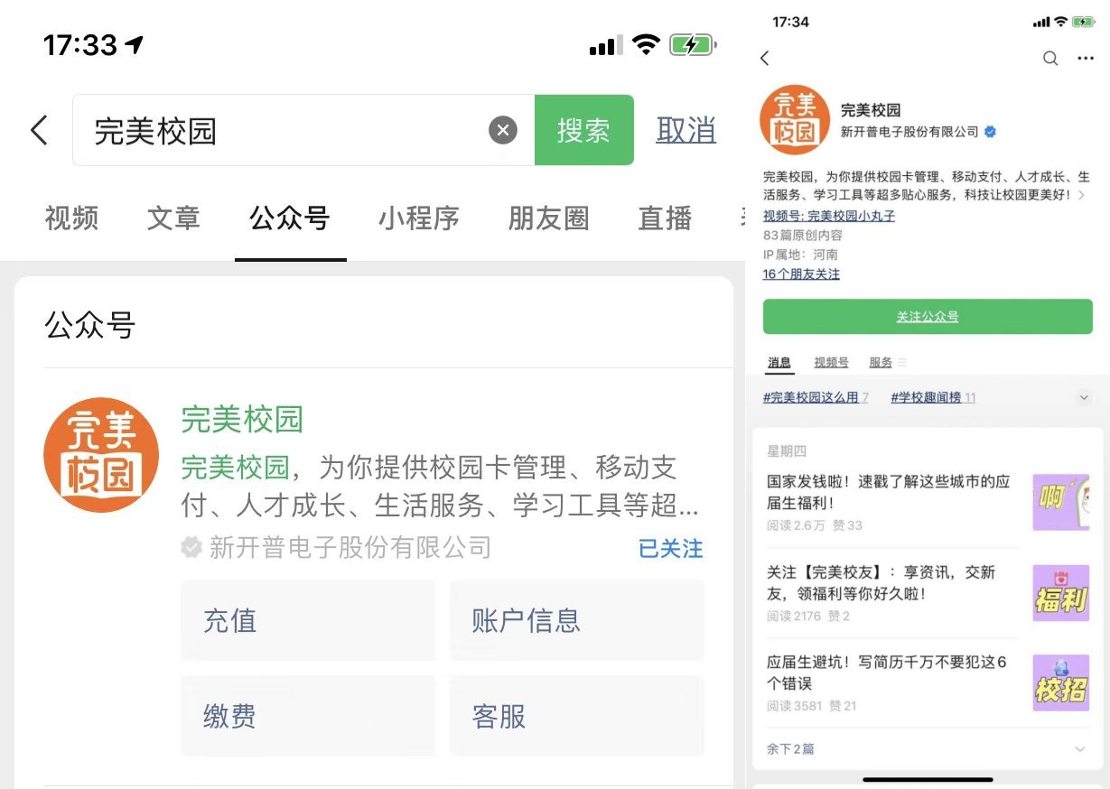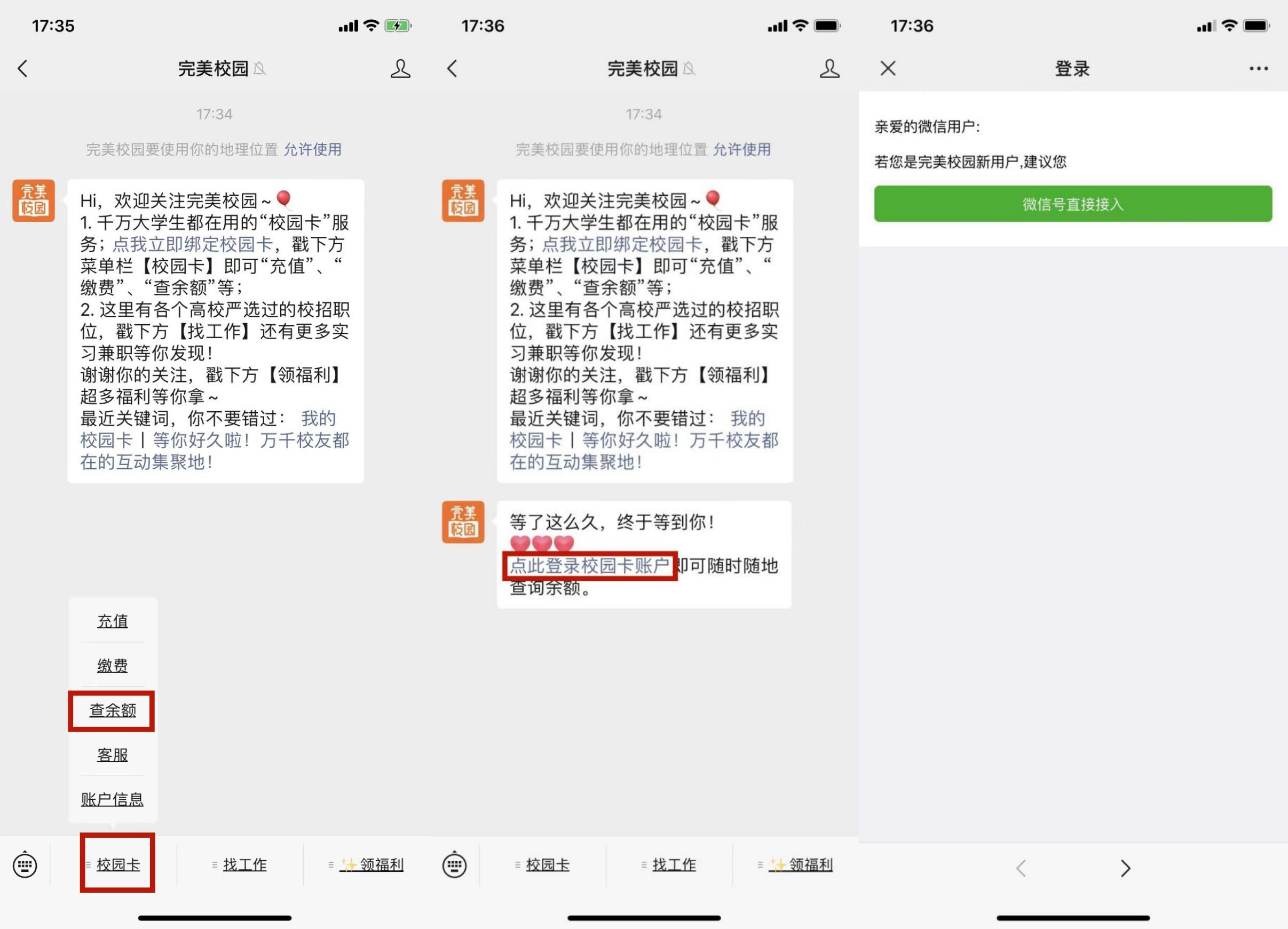 (二)进入公众号,选择下方校园卡——查余额;点击进入系统回复的链接“点此登录校园卡账户”,选择微信号直接进入;