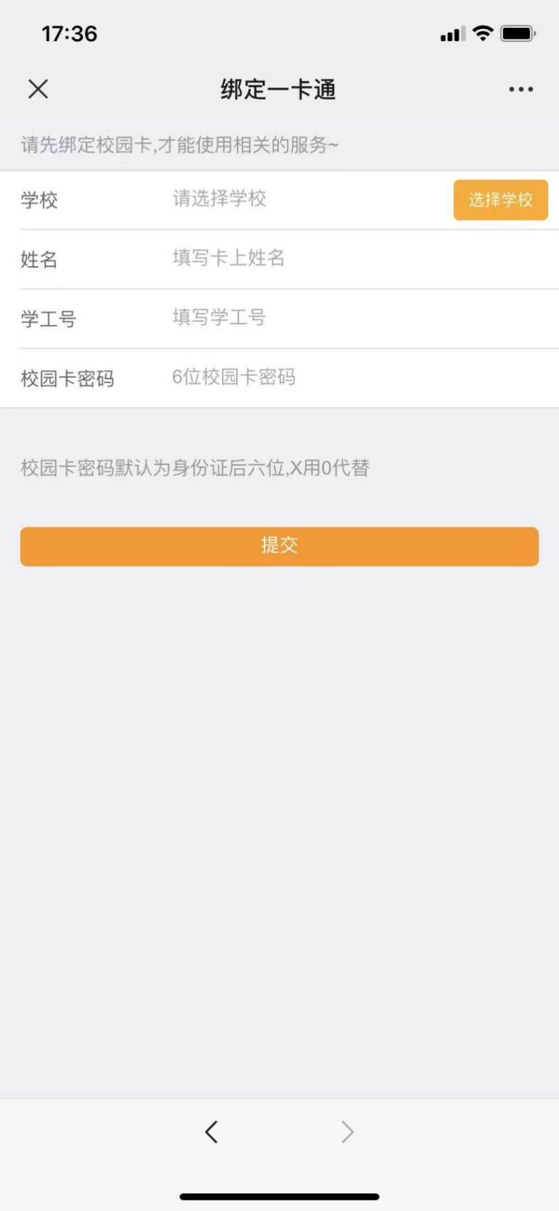 (三)进入绑定一卡通界面,学校选择陕西中医药大学,并输入姓名、学号/工号、校园卡密码(密码默认为身份证后六位),填写完成后,点击提交进行绑定;