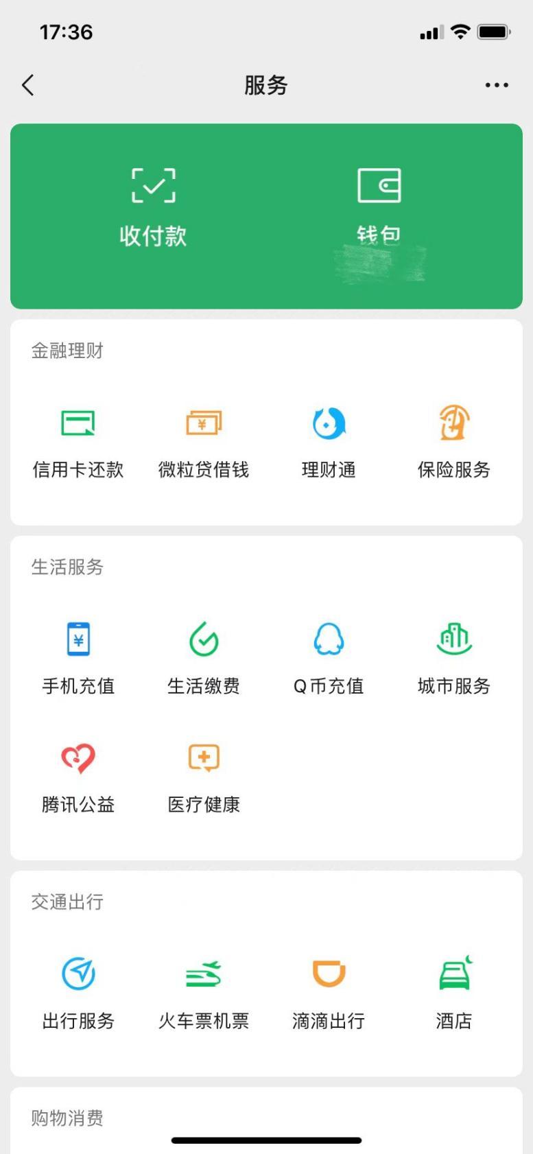(四)返回微信首页,点击下方我——服务——收付款,将生成的付款码在消费POS机上扫码完成支付;